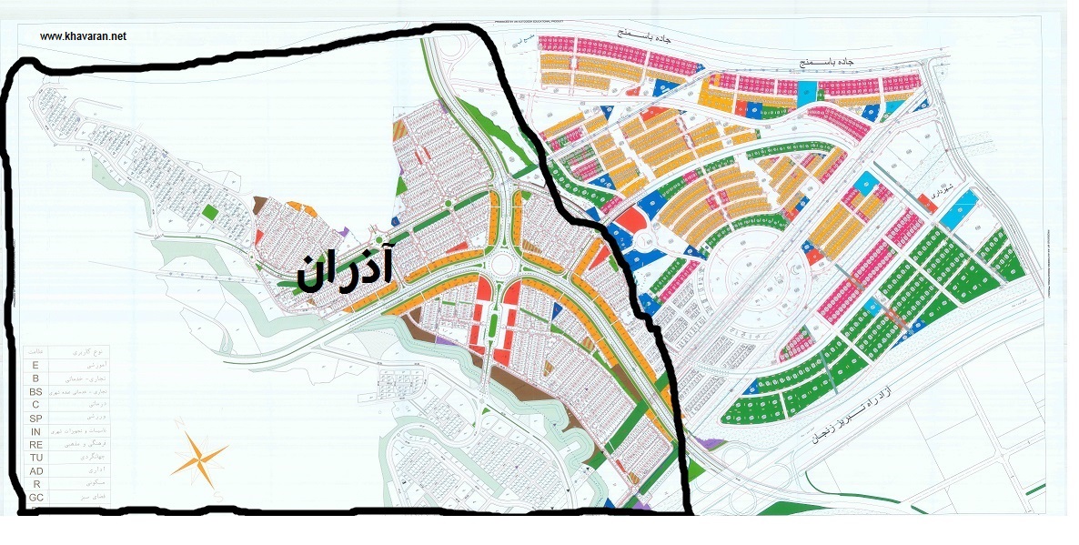 شهرک آذران در ضلع غربی شهرک خاوران واقع شده است که در واقع ادامه ی شهرک خاوران می باشد که هردو چسبیده بهم در یک نقشه تحت عنوان فاز یک خاوران ترسیم شده است . آذران از سمت غرب به یاغچیان تبریز ، از سمت شرق به شهرک خاوران و از سمت جنوب به اتوبان تبریز - تهران و از سمت شمال به جاده باسمنج متصل می باشد در نقشه ذیل بخش آذران با رنگ فسفری حاشور زده شده است در حال حاضر قیمت ها در شهرک آذران از هر متر مربع 650 هزار تومان لغایت 1250000 تومان می باشد . قیمت های زیر 700 هزار تومان معمولا از نظر اختلاف سطح پایین تر از اکثر قطعات می باشند